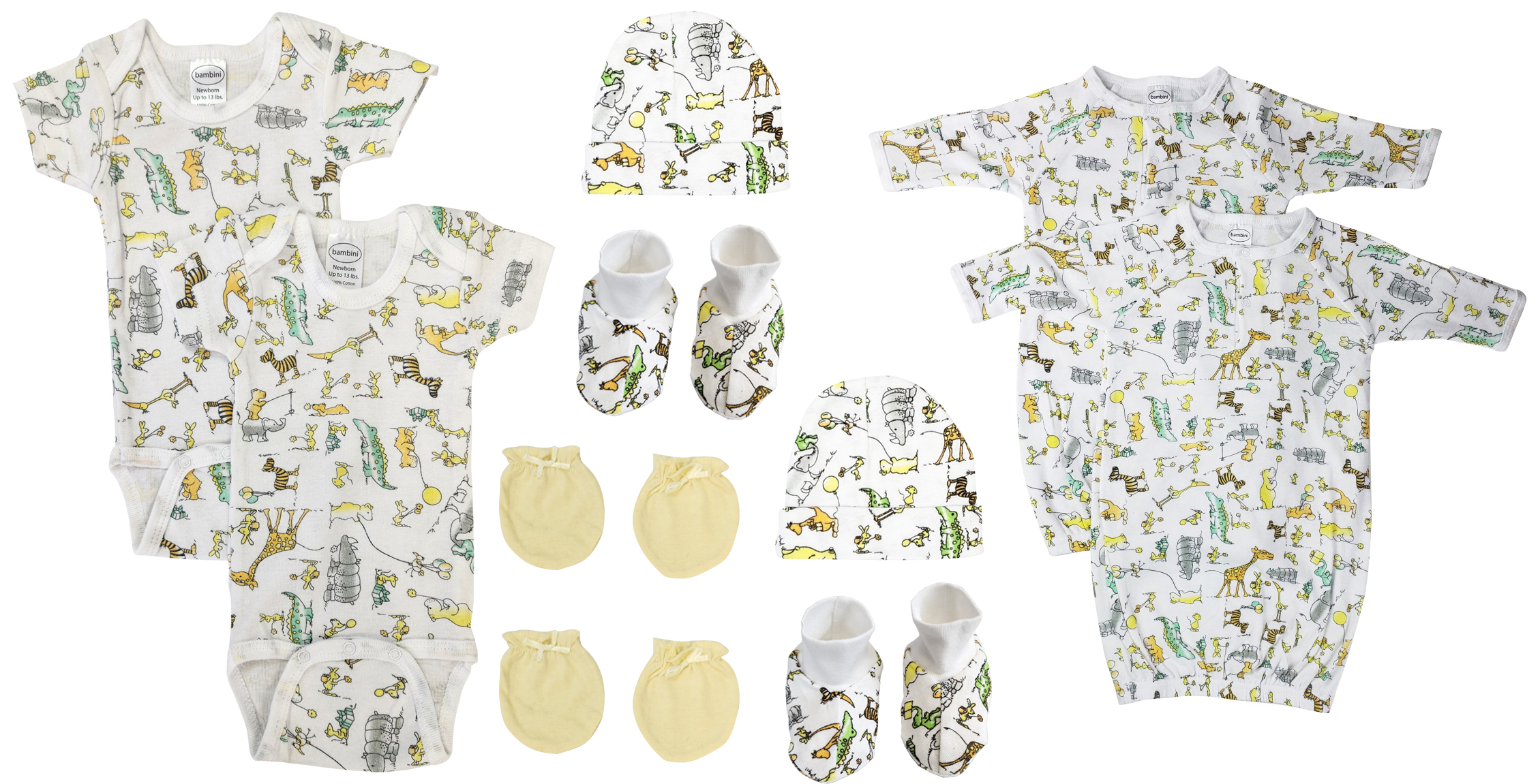3 pc Baby Gift Set (100% Cotton), 3 pc Baby Gift Set (100% Cotton), Unisex Print Gown (100% Cotton), Unisex Print Gown (100% Cotton), Yellow Infant Mittens (Jersey), Yellow Infant Mittens (Jersey)