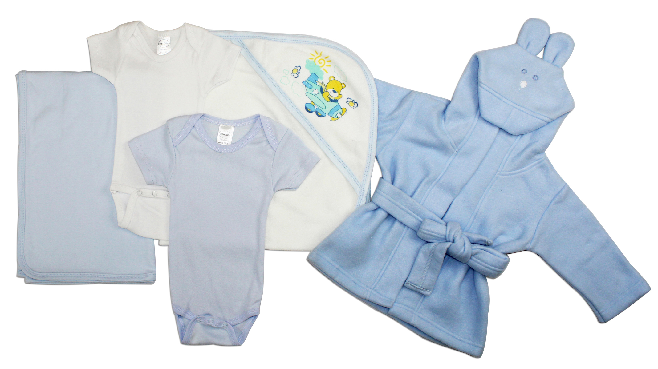 Short Sleeve Onezie Bodysuits (100% Cotton), Blue Short Sleeve Onezie (100% Cotton), Blue Knotted Baby Cap (100% Cotton), Blue Infant Mittens (Jersey), Blue Receiving Blanket (100% Cotton), Terry Hooded Towel With Screen Prints (80% Cotton / 20% Polyester), Blue Fleece Robe With Hoodie (Polyester)